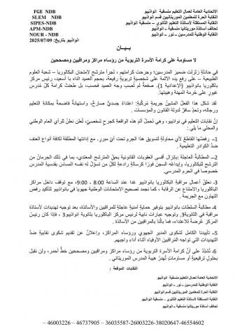 وأكدت النقابات، في بيان تلقته مراسلون مساء اليوم، أن هذه الخطوات تأتي دفاعا عن كرامة الأسرة التربوية، ورفضا لأي شكل من العنف ضد الطواقم التعليمية.