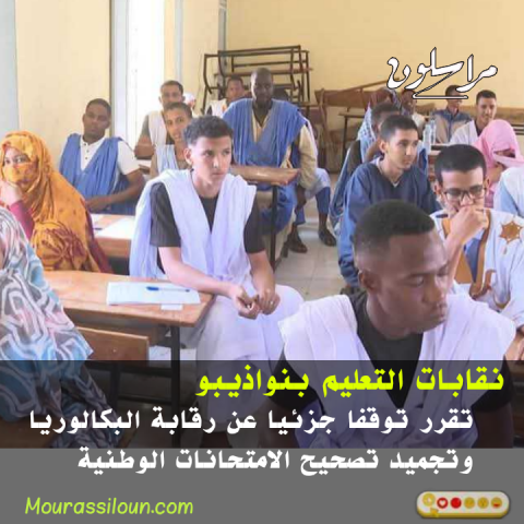 أعلنت نقابات التعليم في نواذيبو عن توقف جزئي عن مراقبة امتحان البكالوريا صباح الخميس، من الساعة الثامنة حتى التاسعة، بالإضافة إلى تجميد التصحيح الجهوي، احتجاجًا على اعتداء تلميذ على رئيس مركز الامتحان أمس.