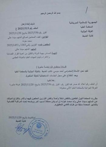 ونص القرار على "قبول الطعنين بالنقض شكلا وأصلا ونقض القرارين المطعون فيهما والأمر بالإفراج المؤقت عن المتهم سيدنا عالي ولد محمد خونه (...).