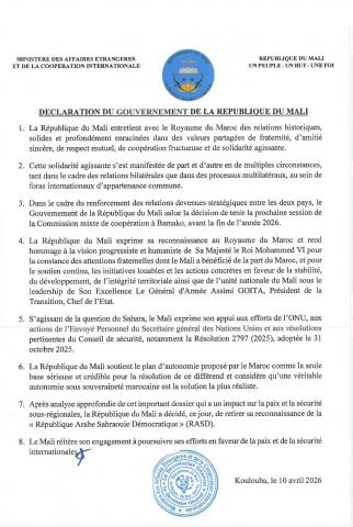 وأضافت وزارة الخارجية المالية أنها تؤيد خطة المغرب للحكم الذاتي في الصحراء الغربية مشيرة إلى عمق الروابط التاريخية بين مالي والمغرب .