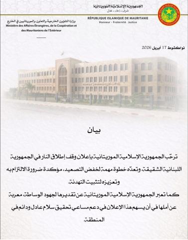 رحبت موريتانيا بإعلان وقف إطلاق النار في لبنان واعتبرته خطوة نحو خفض التصعيد.